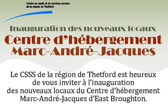 Le CSSS de la région de Thetford procédera à l’ouverture officielle de nouveaux locaux. Pour l’occasion, le CSSS de Thetford est heureux de vous inviter à l’inauguration des nouveaux locaux du Centre d’hébergement Marc-André-Jacques d’East Broughton. L’inauguration aura lieu le lundi 29 avril 2013 dès 19h30. Les locaux du Centre d’hébergement Marc-André-Jacques qui seront inaugurés se trouvent au 272, rue Principale à East Broughton.