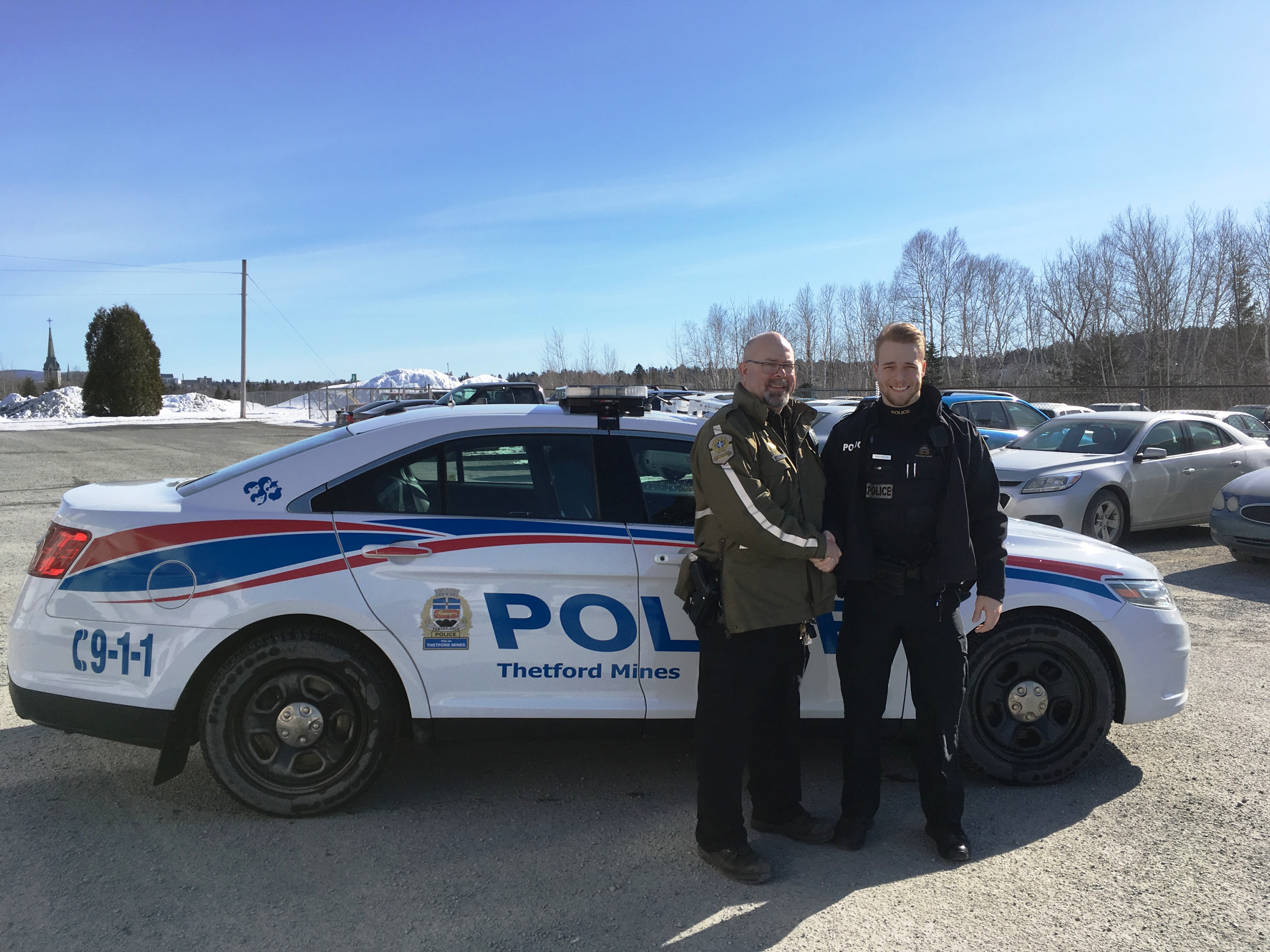 Au cours des 119 années d’existence de la Sûreté Municipale de Thetford Mines, c’est la seconde fois où un père et son enfant tous deux policiers, seront réunis dans la même voiture de patrouille pour une journée. L’agent MATHIEU BOUCHER, jeune policier patrouilleur a fait son entrée en service à la Sûreté Municipale de Thetford Mines en mai 2017, après avoir complété sa formation à l’École nationale de police du Québec et réussi notre processus de sélection. Il a grandi en voyant son père RICHARD BOUCHER, qui a débuté sa carrière en mai 1988, à la Sûreté municipale de Sept-Îles, comme policier- pompier. En 2001, les policiers de cette municipalité ont été intégrés à la Sûreté du Québec. Puis en 2013, l’agent Boucher « père » a continué sa carrière de policier au poste autoroutier du Grand-Québec. À l’aube de ses 30 années de carrière, Richard Boucher aura l’opportunité de pouvoir passer une journée en patrouille dans la ville où son fils amorce sa propre carrière.