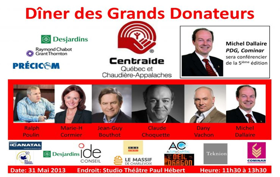 Cette année, les participants au Dîner des grands donateurs auront la chance d’entendre une conférence de Michel Dallaire, président directeur général de Cominar et, seront également présents : Ralph Poulin de Canatal, Marie-Hélène Cormier de Desjardins, Jean-Guy Bouthot de IDE Conseil, Claude Choquette de HDG inc. & Le Massif ainsi que Dany Vachon de Azur & Capital et Dragon lors de la première saison.