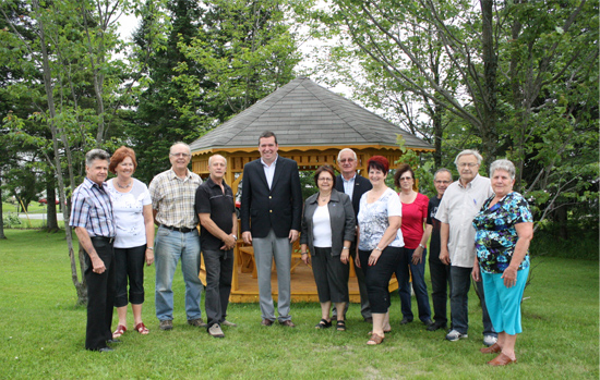 Le député/ministre Christian Paradis est accompagné à sa gauche par la présidente du Club, Mme Émilienne Chouinard et aussi par plusieurs membres de la FADOQ. Ils posent devant leur tout nouveau gazebo, construit grâce à la subvention reçue de Nouveaux Horizons.