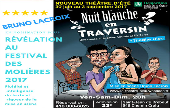Du 30 juin au 3 septembre, tous les vendredis, samedis et dimanches soir, sera présentée la pièce « Nuit blanche en traversin » au nouveau Théâtre Bleu de Saint-Jean-de-Brébeuf.
