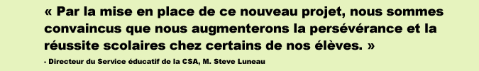 « Par la mise en place de ce nouveau projet, nous sommes convaincus que nous augmenterons la persévérance et la réussite scolaires chez certains de nos élèves, particulièrement chez les élèves handicapés ou en difficulté d’apprentissage et d’adaptation. De plus, cette plate-forme de travail permettra de qualifier davantage la clientèle en formation des métiers semi-spécialisés par l’entremise de la formation générale des adultes », ajoute le directeur du Service éducatif de la CSA, M. Steve Luneau.